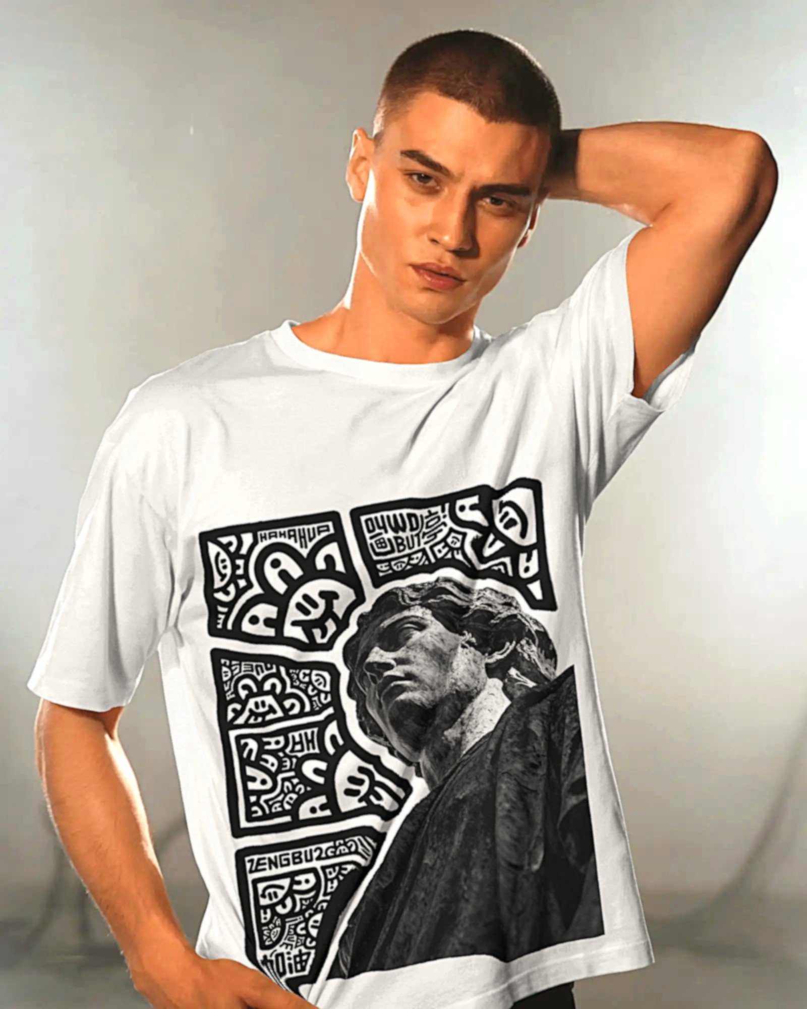 A fresh white tee featuring a bold mash-up of a classical statue and trippy black-and-white doodle art — a perfect blend of vintage vibes and street-style chaos. Total statement piece.