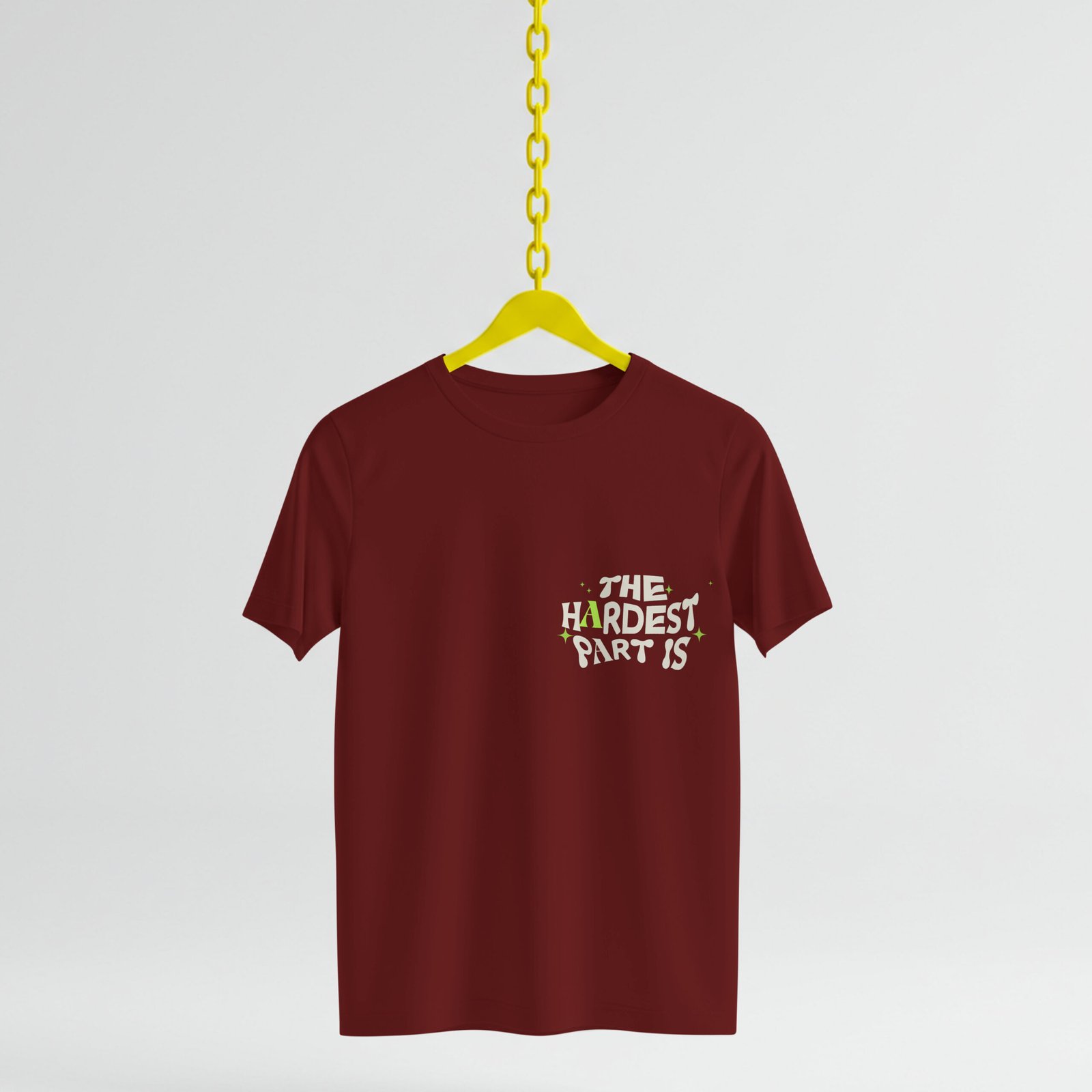 This maroon oversized tee is a whole mood — featuring a bold back print that reads “The hardest part is always the beginning” with a fresh, stylized pop of green. Super comfy, super motivational, and perfect for leveling up your everyday drip.