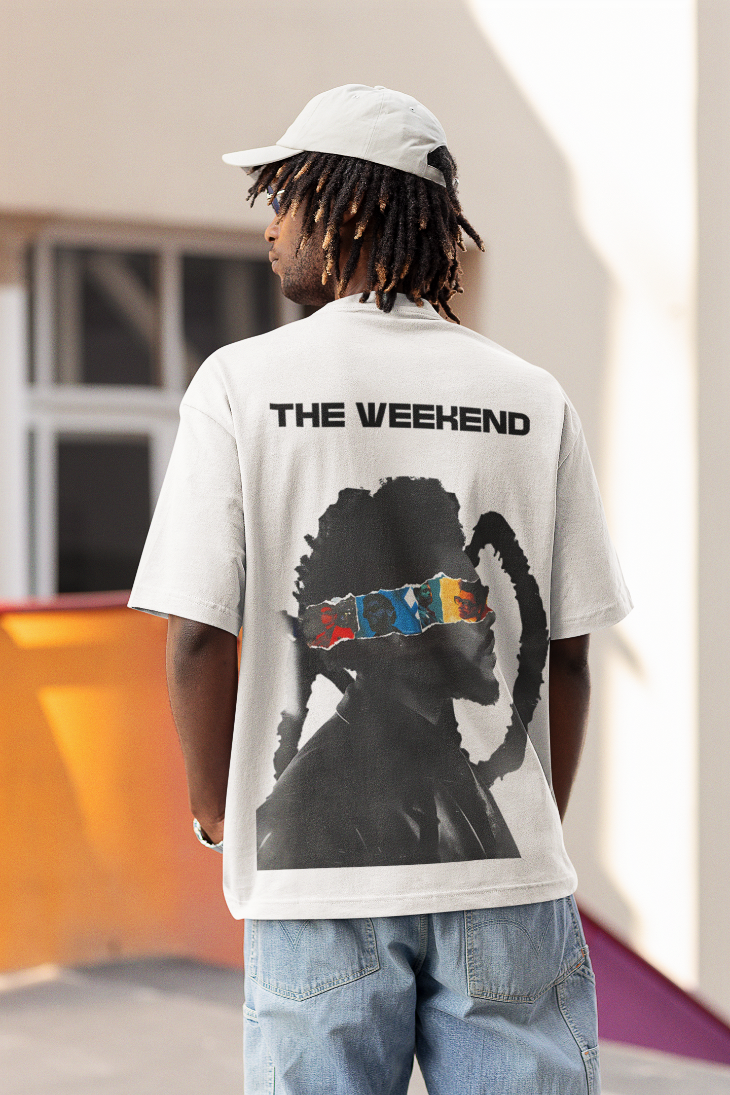 This white tee goes crazy with its artsy back print — featuring a bold “THE WEEKEND” text and a stylized silhouette graphic with a vibrant color-strip detail across the eyes. Clean, modern, and perfect for anyone who vibes with bold, aesthetic streetwear.